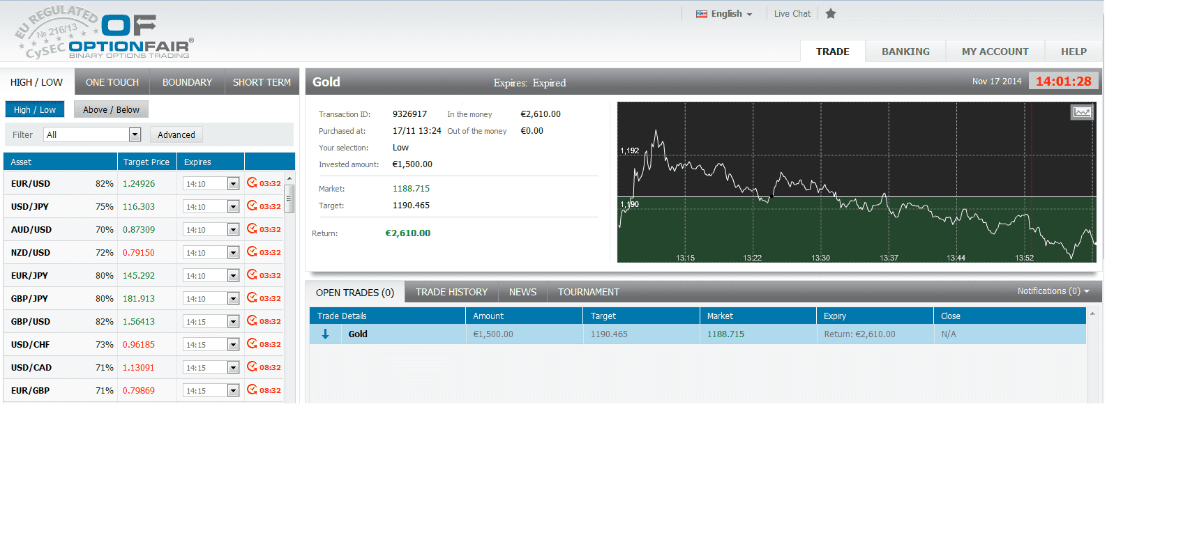 Utilizando la plataforma de opciones binarias de OptionFair™ negociamos $1500 utilizando el instrumento "Low", el cual tiene un retorno del 74% si la opción cierra por debajo del precio objetivo.