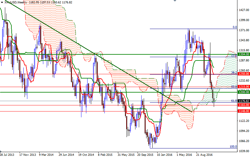 El precio del oro cerró la semana perdiendo 6,13 dólares a 1176,82 dólares la onza después de que los datos económicos fuertes de EEUU reforzaron el caso para que la Reserva Federal adopte una postura más agresiva en su política monetaria. El par XAU/USD intentó romper la zona de 1200-1197 dólares, que había señalado como una clave para niveles más altos a principios de la semana pasada, pero finalmente fracasó y comenzó a desmoronarse. Como resultado, los precios cayeron por debajo de la zona de 1171/69 y probaron el soporte en alrededor de 1160, como se esperaba.