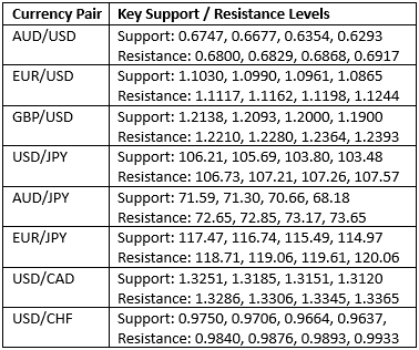 Enseñamos que las operaciones deben ser ingresadas y salidas en o muy cerca de los niveles clave de soporte y resistencia. Hay ciertos niveles clave de soporte y resistencia que deberían ser observados en los pares de divisas más populares esta semana, lo que podría resultar en reversiones o rupturas: