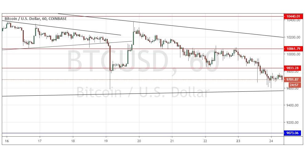 Ayer escribí que el gráfico de precios estaba dominado por la línea de tendencia bajista a largo plazo que estaba reprimiendo el precio. Estaba listo para tomar un sesgo bajista más tarde si hubiéramos tenido dos cierres consecutivos por hora por debajo del fuerte soporte de 9.801 dólares, ya que el panorama técnico más amplio sugería un colapso. Esta fue una buena decisión, ya que el nivel se rompió, y el precio de la moneda está actualmente alrededor de $75 por moneda por debajo del punto de entrada dado ayer para una operación de corto plazo.