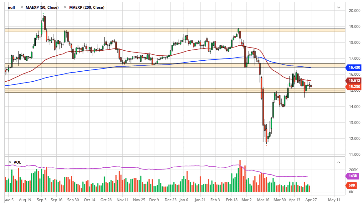 Los mercados de la Plata han hecho extraordinariamente poco en las últimas sesiones de trading ya que el mercado baila alrededor del nivel de US$ 15.20. El nivel de apoyo más obvio es el nivel de $15.00, un área que por supuesto es una figura grande, redonda y psicológicamente significativa. Mientras que los metales preciosos se han comportado razonablemente bien en comparación con otros activos, la Plata juega un papel secundario en el mercado del Oro, por decir lo menos.