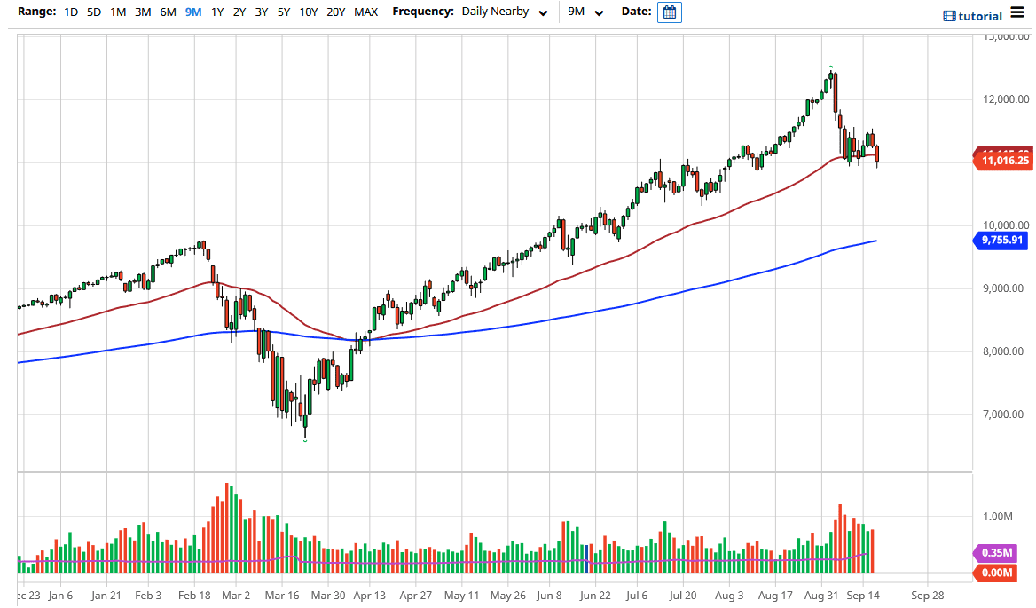 El NASDAQ 100 ha vuelto a caer durante la sesión de trading del jueves, alcanzando el nivel de 10.900 antes de tener un pequeño rebote. Pensando extensamente, el nivel de 11.000 es básicamente donde está el soporte, y creo que es sólo una cuestión de tiempo antes de que tengamos que decidir si esto va a ser o no un área que se va a mantener, o si va a ser un área en la que el mercado se abre paso y baja.