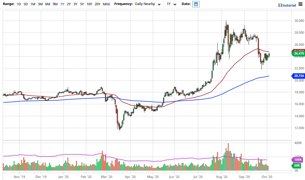 Los mercados de la Plata se recuperaron un poco durante la sesión trading del lunes, llegando a la EMA de 50 días. Haciendo esto, parece que el mercado va a continuar presionando la EMA de 50 días, y tal vez tratar de hacer un intento un breakout. No obstante, no será hasta que superemos la EMA de 50 días en un cierre diario que seré un comprador, ya que mostraría un breakout técnico de nuevo. El nivel de US$ 25 obviamente causará un poco de importancia psicológica y presión, pero una vez que pasemos todo eso debería enviar a este mercado mirando hacia el nivel de US$ 27 bastante rápido ya que fue el escenario del suministro más reciente.