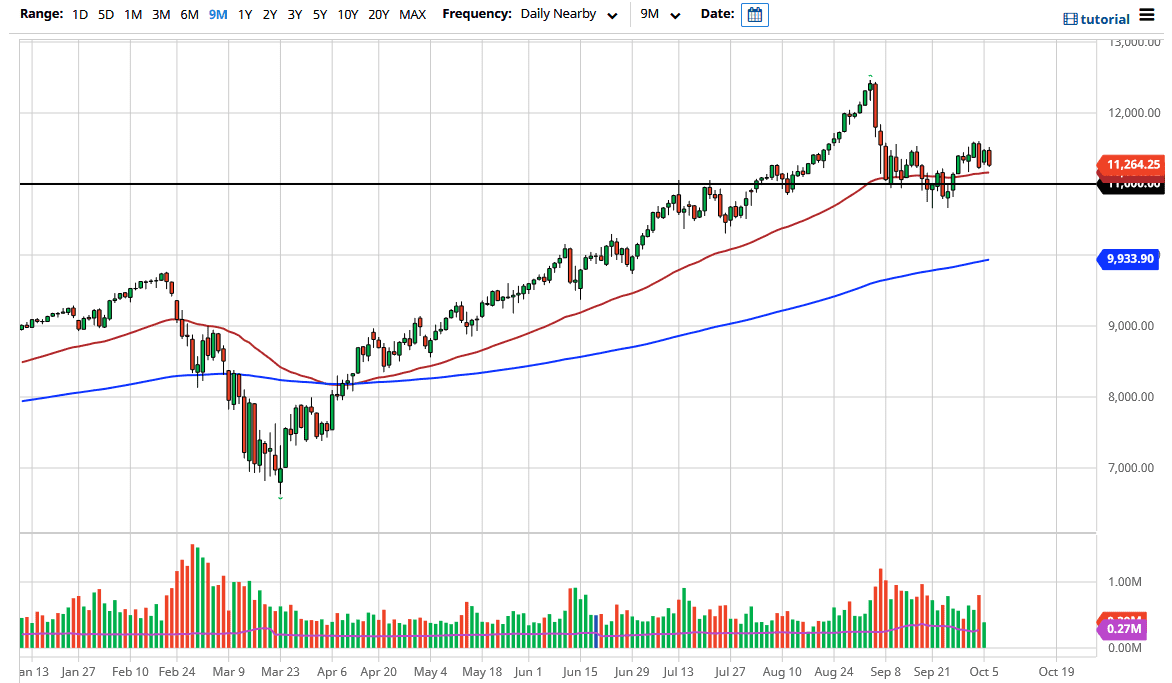 El nivel de 11.000 por debajo debería ofrecer una cantidad significativa de soporte, al igual que la EMA de 50 días lo podría hacer. En última instancia, sin embargo, creo que el mercado está operando sobre la base de la emoción en este momento, y el hecho de que estamos empezando a ver la posibilidad de más luchas internas en Washington DC. El hecho de que el estímulo puede tener que esperar hasta después de las elecciones, muestra lo desarticulado que está el gobierno de los EE.UU., y saca a la luz el hecho de que muchos traders están simplemente esperando algún tipo de rescate, sé que no es una gran sorpresa, pero parece ser el caso.
