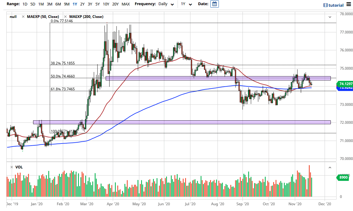 La EMA de 50 días se encuentra justo por debajo de los niveles actuales, y la pequeña vela es como un martillo invertido. Esto es una señal potencial, debido al hecho de que tenemos un poco de una actitud del tipo "empujar-tirar". Si superamos la parte superior del martillo invertido es muy posible que nos encontremos alcanzando de nuevo el nivel ₹74.50. Sin embargo, si sufrimos un breakdown por debajo de la EMA de 50 días, entonces empezamos a amenazar la idea de la EMA de 200 días. Este es, por supuesto, un indicador a largo plazo al que mucha gente presta atención, así que uno tendría que asumir que hay un poco de soporte construido en él. Además, es donde habíamos visto resistencia previa, así que es probable que haya un poco de suelo a corto plazo en esta área también. Esto podría continuar elevando el Dólar Estadounidense, pero mi sospecha es que para operar en este mercado es necesario buscar en otros pares de monedas también.