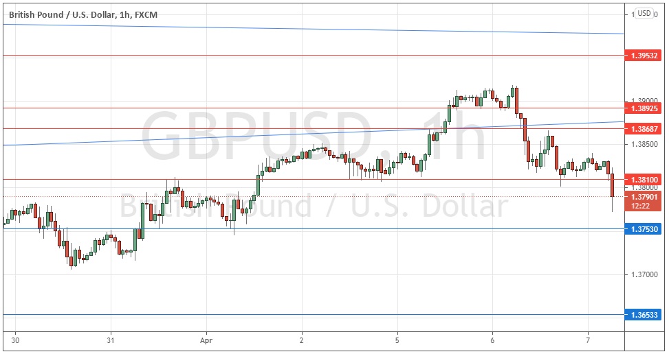 - Entre en corto después de una inversión a bearish de la acción del precio en el marco temporal H1, tras el siguiente toque de 1.3810, 1.3867, o 1.3893.