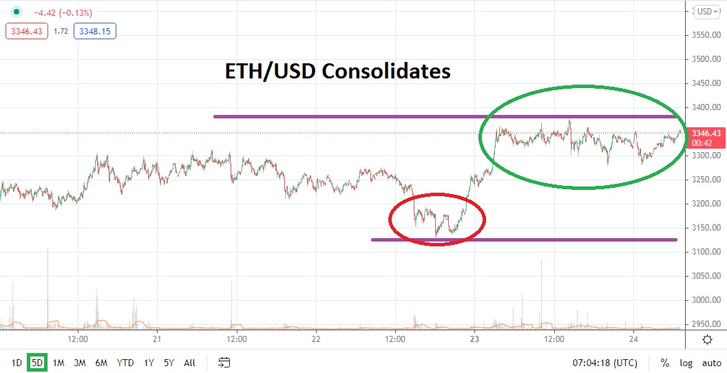 El ETH/USD está cotizando cerca de importantes máximos a mediano plazo que no se han tocado desde mediados de mayo, y los especuladores pueden verse atraídos por las aguas tranquilas que la criptodivisa ha alcanzado en los últimos días. El ETH/USD está cotizando cerca de los 3350.00 y ha mostrado una capacidad de consolidación dentro de su banda de precios actual mientras prueba máximos importantes. Sí, esto es Ethereum y la volatilidad podría estallar sin previo aviso, pero por ahora el mar está en calma.