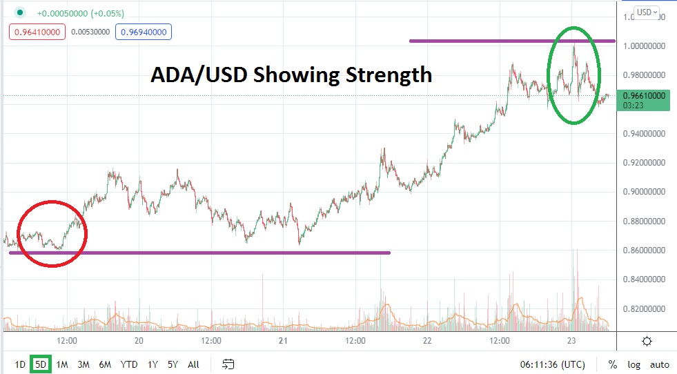 Si se está produciendo un cambio real de sentimiento y la promesa de la primavera empieza a entusiasmar a los traders de criptodivisas, entonces el ADA/USD puede estar listo para ver una carrera alcista (bullish) más larga. Si el ADA/USD rompe por encima de la marca de 97 centavos a corto plazo y muestra una capacidad no sólo para sostener su valor, sino también para crear una velocidad sincera más alta, los traders pueden querer estar listos para posicionar órdenes de compra que se encienden a través del impulso positivo.