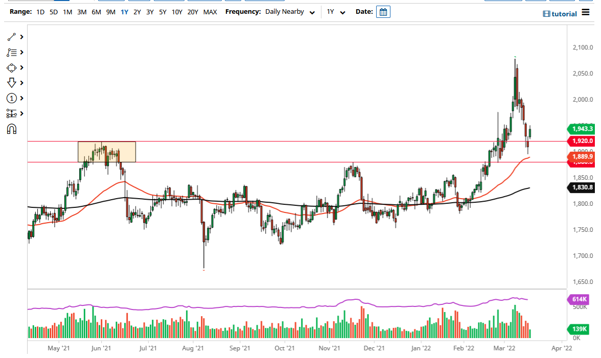 Por debajo, veo la EMA de 50 días en el nivel de $1890 como un soporte significativo, junto con el nivel de $1880, siempre y cuando podamos mantenernos por encima de todo eso, entonces el mercado más que probablemente encontrará compradores cada vez que caigamos. Sin embargo, si se rompe por debajo del nivel de $1880, es factible que se produzca una ruptura (breakdown) significativa. En ese punto, yo anticiparía que el mercado va a buscar la EMA de 200 días. En ese punto, es más que evidente que el mercado tratará de encontrar compradores de nuevo, pero mucho de esto dependerá de las expectativas de inflación y de si el mundo es o no un lugar seguro, por así decirlo.