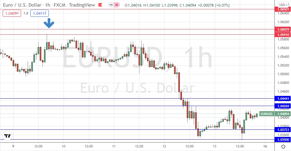 Esperaba que el nivel de $1.0591 funcionara como resistencia, ya que anteriormente había actuado como soporte y resistencia. Obsérvese cómo estos niveles "invertidos" pueden ser puntos de reversión muy fiables. El gráfico H1 de abajo muestra cómo el precio rechazó este nivel con una acción de precios bajista (bearish) que incluyó una barra casi interna durante la sesión de Nueva York el lunes pasado. El punto de entrada está marcado por la flecha hacia abajo en el gráfico de precios de abajo. Esta operación ha sido muy rentable, logrando una relación riesgo/recompensa positiva máxima de 5 a 1 basada en el tamaño de la estructura de velas de entrada.