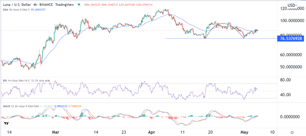 El gráfico de trading a cuatro horas muestra que el precio de LUNA encontró un fuerte soporte en $76.53 en abril. Ahora ha retrocedido tras la última decisión sobre las tasas de interés de la Reserva Federal. Una mirada más cercana muestra que la divisa de Forex ha formado lo que parece un patrón de copa y manija invertida. El MACD se ha movido ligeramente por encima del nivel neutro, mientras que el Índice de Fuerza Relativa está en torno a 50.