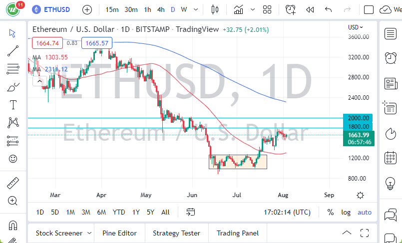 El mercado ha visto un montón de ruido entrecortado en esta área, y seguirá siendo el caso, ya que estamos tratando de romper al alza (breakout), pero no tenemos un catalizador en este momento. El nivel de $1800 por encima es una resistencia significativa que se extiende hasta el de $2000, por lo que romper a través de eso es el objetivo de los traders alcistas (bullish), pero no considero que tengan el impulso suficiente.