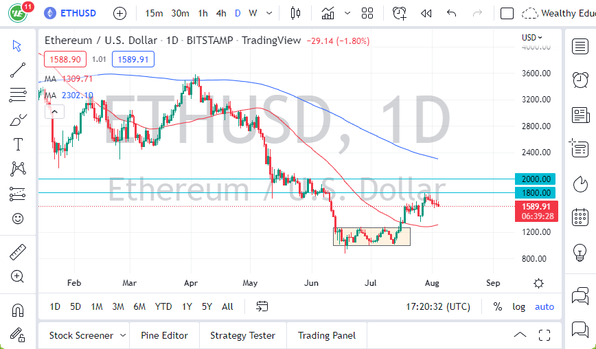 Por debajo, la EMA de 50 días ofrecerá un nivel de soporte dinámico, ya que está empezando a curvarse ascendentemente. El área de $1200 por debajo es la parte superior de una zona de consolidación que se extiende hasta al menos los $900. En definitiva, este es un mercado que tiene posibilidad de hacer alguna clase de fondo, pero si fuéramos a romper a la baja (breakdown) por debajo de esa zona, entonces podríamos desmoronarnos.