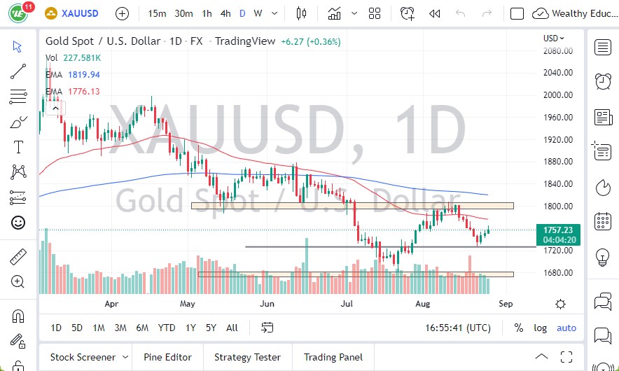 El mercado del Oro al contado repuntó (rally) un poco durante la sesión de trading del jueves, hasta superar el nivel de $1760. Dicho esto, es probable que el sistema continúe con mucho ruido. En última instancia, los inversores del Oro están esperando lo que suceda el viernes por la mañana, ya que Jerome Powell tiene un discurso en el Simposio de Jackson Hole. Los traders están tratando de averiguar si la Reserva Federal va a reiterar su actitud agresiva (hawkish) o si va a pivotar. Al fin y al cabo, las noticias económicas son un tanto contradictorias, pero la inflación sigue siendo un tema relevante.
