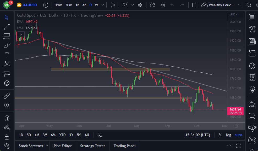 Los mercados de Oro se han vendido drásticamente durante la sesión de trading del miércoles, ya que seguimos viendo una gran fortaleza en el Dólar estadounidense y, por supuesto, en las tasas de interés de Estados Unidos. Habiendo dicho esto, el mercado sigue viendo al Dólar estadounidense como la moneda favorita del mundo, y mientras ese sea el caso, el Oro recibirá una pequeña paliza. En este punto, parece que estamos listos para llegar a los mínimos de nuevo, y luego tal vez incluso romper a través de allí.