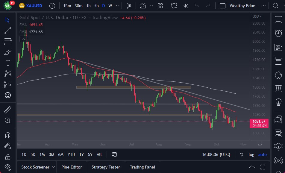 La forma de la vela de Forex es como una estrella fugaz, y si rompemos a la baja (breakdown) por debajo de la parte inferior de la vela, es probable que podamos ir mucho más abajo. De hecho, si rompemos a la baja (breakdown) por debajo de los últimos mínimos, estaríamos violando la parte inferior de un "doble fondo", lo que obviamente es una señal muy bajista (bearish). En ese momento, es probable que el mercado baje hasta los $1600. Esta es una zona que tendrá un poco de psicología, pero podríamos llegar al nivel de los $1500.