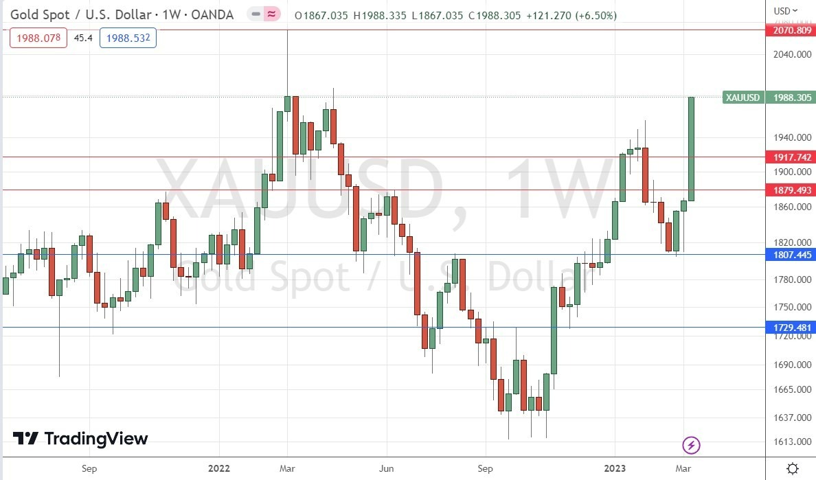 Los traders de tendencia y de ruptura al alza (breakouts) deberían considerar seriamente la compra de Oro incluso sólo por estas indicaciones técnicas. La razón más profunda por la que el Oro está subiendo es probablemente debido a la caída del Dólar estadounidense como refugio seguro debido a la crisis bancaria, y debido a la propia crisis bancaria. Bitcoin también parece estar jugando un papel similar al Oro ahora.