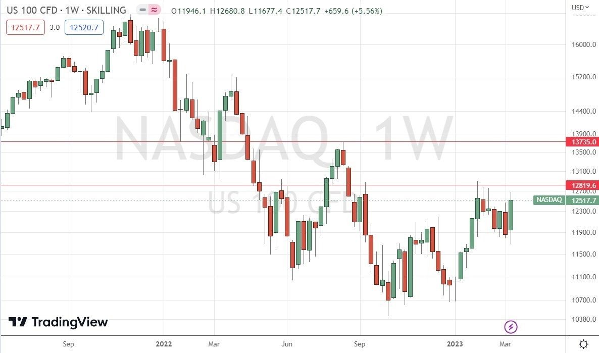 La cotización Índice NASDAQ 100 experimentó una firme subida durante la semana, después de que se produjera un cruce dorado en el gráfico diario a finales de la semana anterior. Los mercados bursátiles se han visto sacudidos por la actual crisis bancaria, pero estamos viendo cómo muchas acciones tecnológicas suben con fuerza mientras la inflación estadounidense sigue cayendo, lo que quita presión a la Reserva Federal para que siga subiendo las tasas, ya que el rendimiento del Tesoro estadounidense a 2 años bajó más de un 1% en aproximadamente una semana. Sin embargo, esto se ve atenuado por la fuerte caída registrada recientemente en la cotización del Índice S&P 500 tras haber realizado un cruce dorado hace unas semanas, desde el que históricamente no se han producido recuperaciones similares en el último siglo.