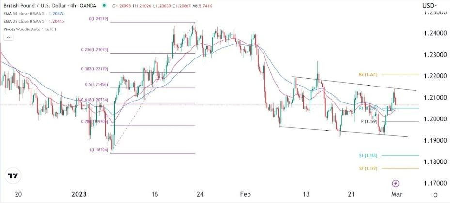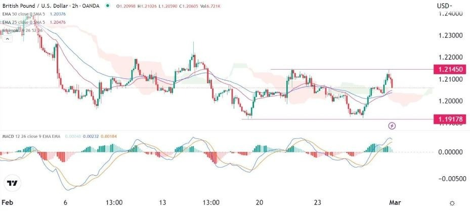 El gráfico Forex de dos horas ofrece más información sobre lo que está sucediendo. El par alcanzó un máximo de 1.2145 el martes, donde le costó superar el 21 de febrero. Se ha formado lo que parece un patrón de doble techo, que suele ser una señal bajista (bearish). Su cuello está en 1.1926, que también fue el punto más bajo el 17 de febrero.