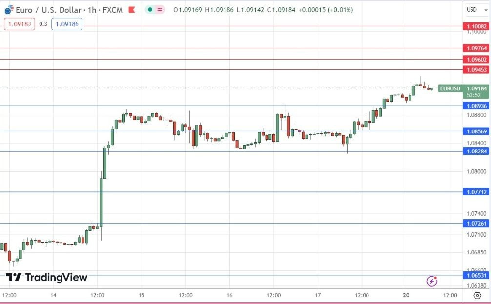 - Entre en largo después de una inversión alcista (bullish) de la acción del precio en el marco temporal H1, tras del siguiente toque de $1.0894, $1.0857, o $1.0828.