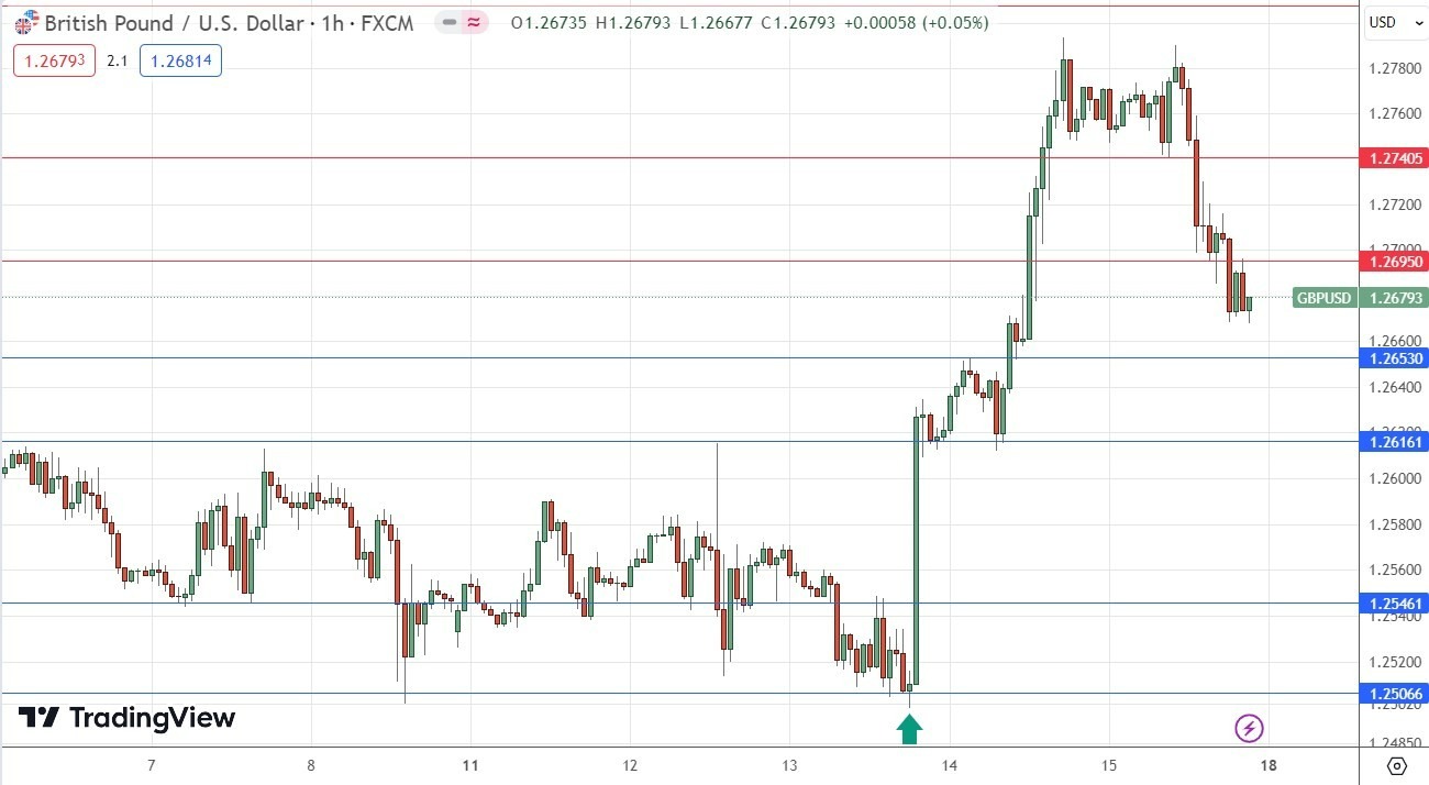Esperaba que el nivel de $1.2507 USD actuara como soporte en la cotización de par de divisas GBP/USD la semana pasada, ya que anteriormente había actuado como soporte y resistencia. Observe cómo estos niveles de "cambio de roles" pueden funcionar bien. El gráfico de precios H1 a continuación muestra cómo el precio rechazó este nivel justo al final de la sesión de Londres del miércoles pasado (que puede ser un buen momento para entrar en operaciones en este par de divisas) con una pequeña vela doji alcista, marcada por la flecha hacia arriba en el gráfico de precios a continuación que señala el momento de este rechazo alcista (bullish). Esta operación ha sido muy rentable hasta ahora, dando una recompensa máxima a la relación de riesgo de más de 14 a 1 basado en el tamaño de la vela de entrada.