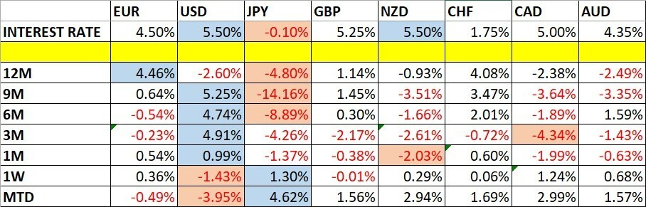 Veamos los datos relevantes de la evolución de los precios de las divisas y las tasas de interés hasta la fecha, que hemos recopilado utilizando un índice ponderado por el comercio de las principales divisas mundiales: