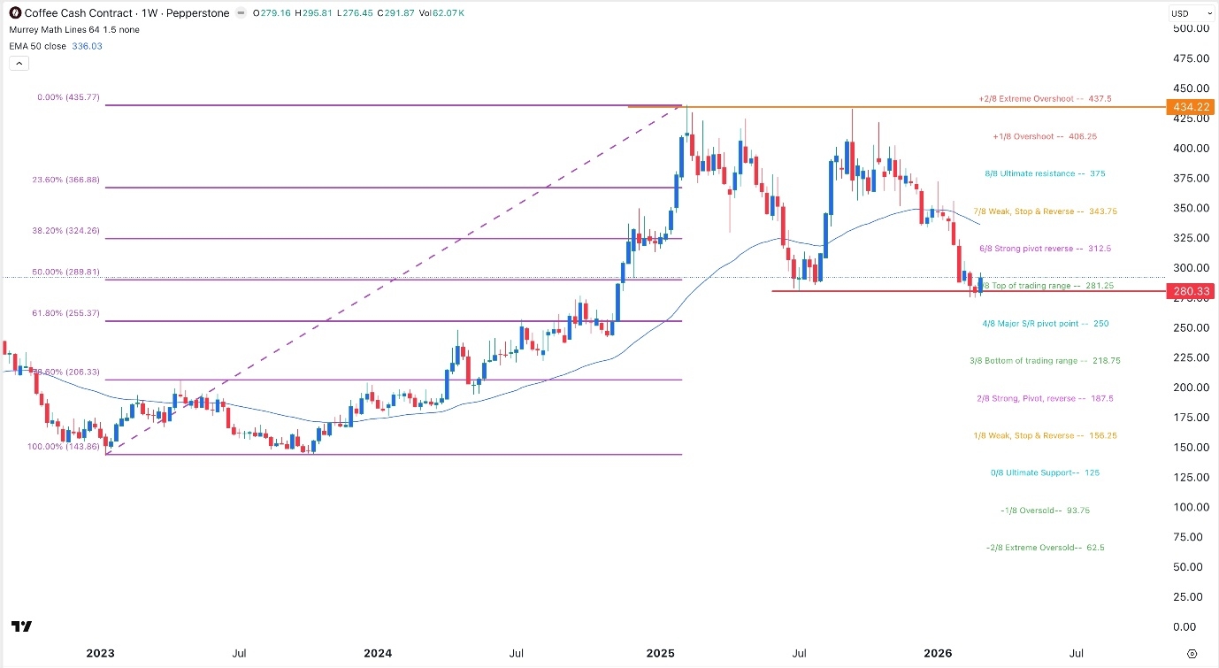 La fricción principal es que el rebote convive con un telón de fondo técnico debilitado. El café cayó por debajo de la media móvil de 50 semanas y también está por debajo de indicadores como Supertrend e Ichimoku.