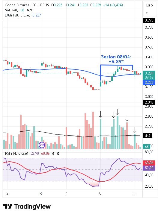 A corto plazo, el precio del cacao vuelve a situarse por encima de su media de 50 períodos (3,227 dólares), aunque con poco margen.