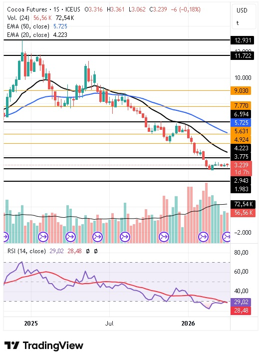 El precio del cacao en la bolsa de futuros de Nueva York abre a 3,226 dólares por tonelada. Al final de la segunda hora de negociación cotiza a 3,239 dólares, para una disminución marginal de 0.40% respecto al cierre previo.