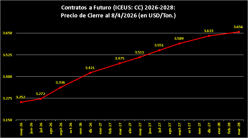 Presentamos la curva a plazo de todos los contratos a futuro de cacao disponibles en el mercado: