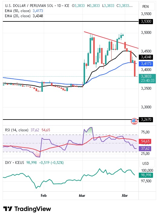 El Índice del Dólar cayó a 98.998 puntos, su nivel más bajo en un mes, lo que arrastró al par USD/PEN, que cotiza sobre los 3.38 soles.